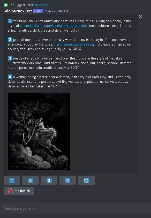 Midjourney’s visual descriptive prompts provide an image-to-text output. This means that users can easily obtain a detailed and descriptive text output based on an image they like by simply uploading the image to Discord and letting Midjourney generate the text, this is called the describe command.