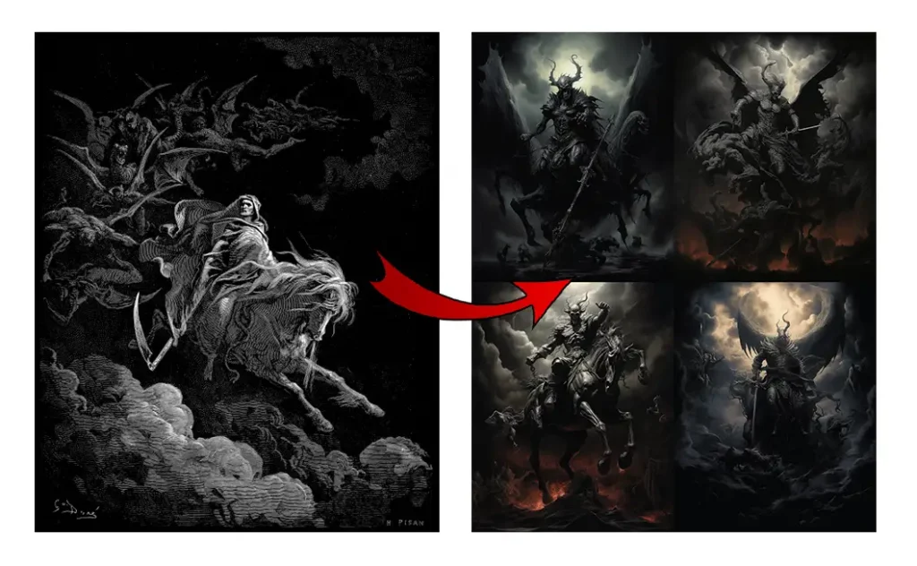 Once you select output 4, you’ll receive the results. You’ll be amazed at how dramatic they are! Midjourney consistently displays the overall chaos captured in the uploaded image.(Gustave Doré’s ”The Vision of Death”).