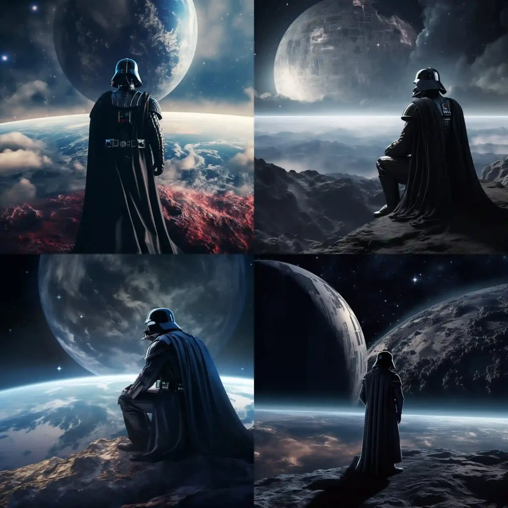 The results from basic text prompts are impressive, but Midjourney does most of the work by freely interpreting the input. For example, Darth Vader appears to be seated in two of the results because I didn’t specify his position. This demonstrates Midjourney’s ability to interpret input creatively.
