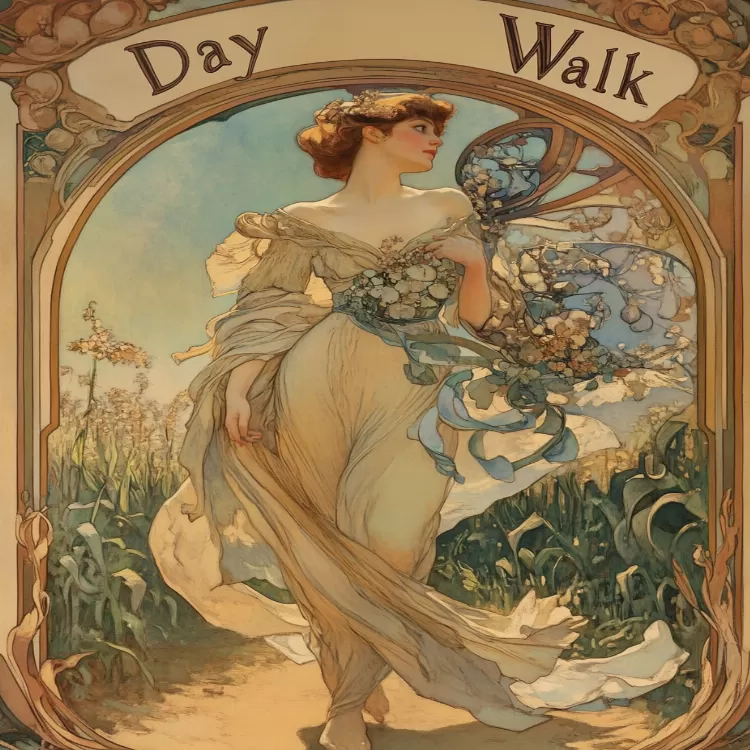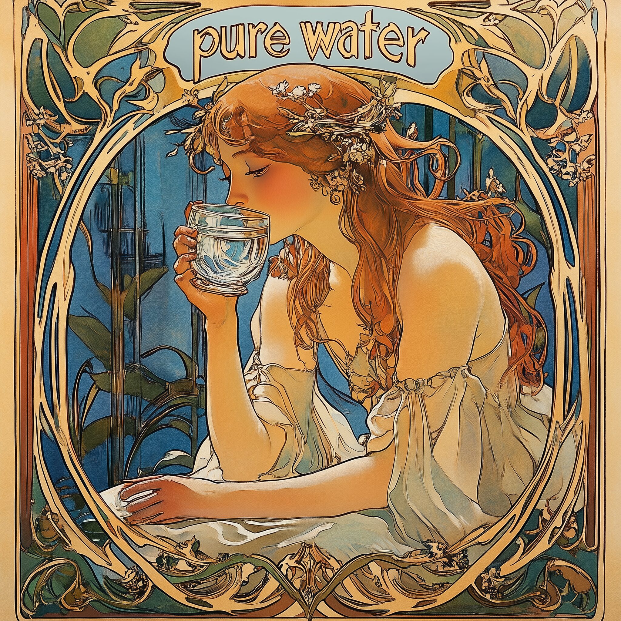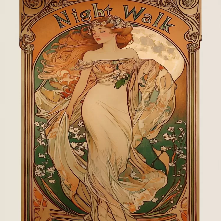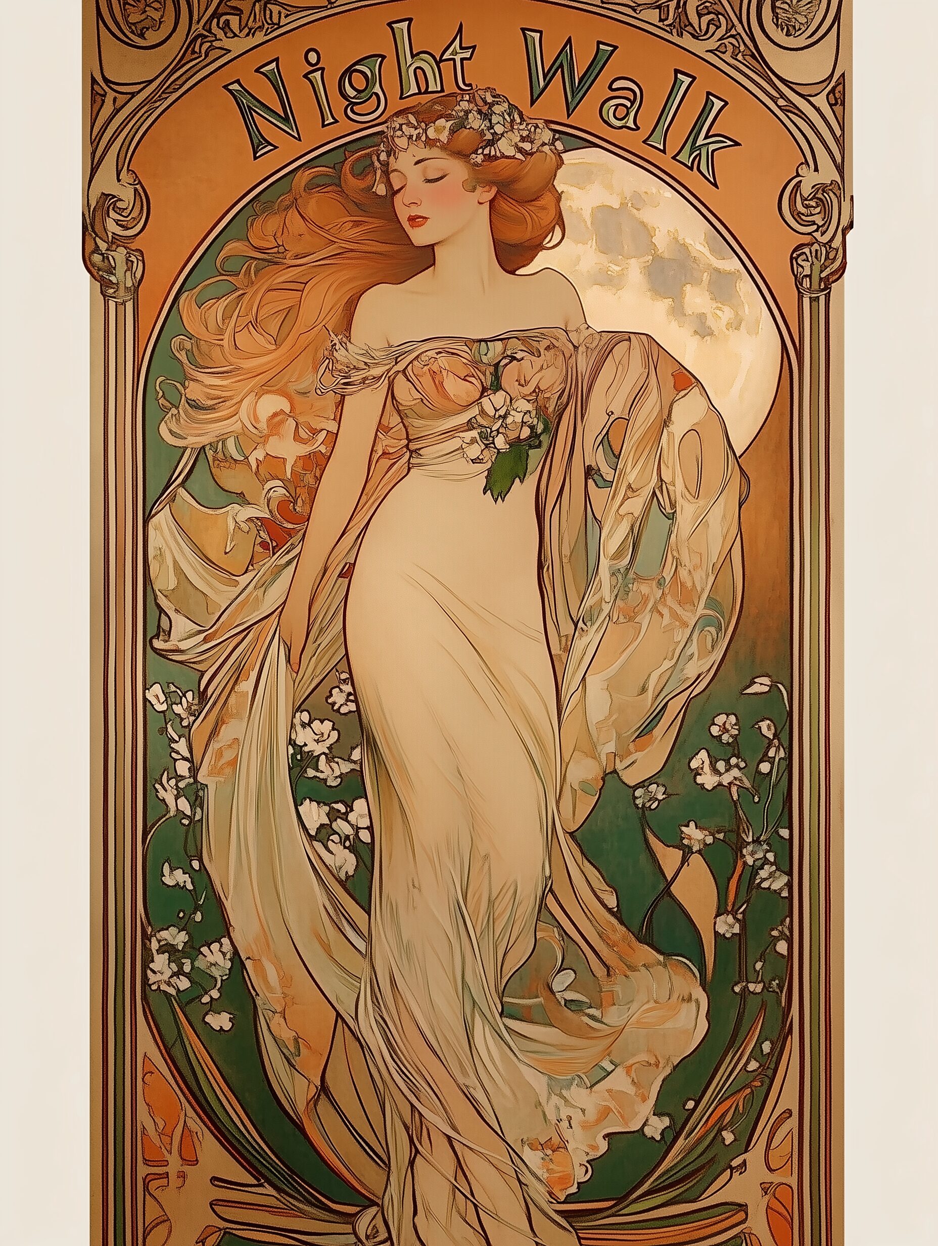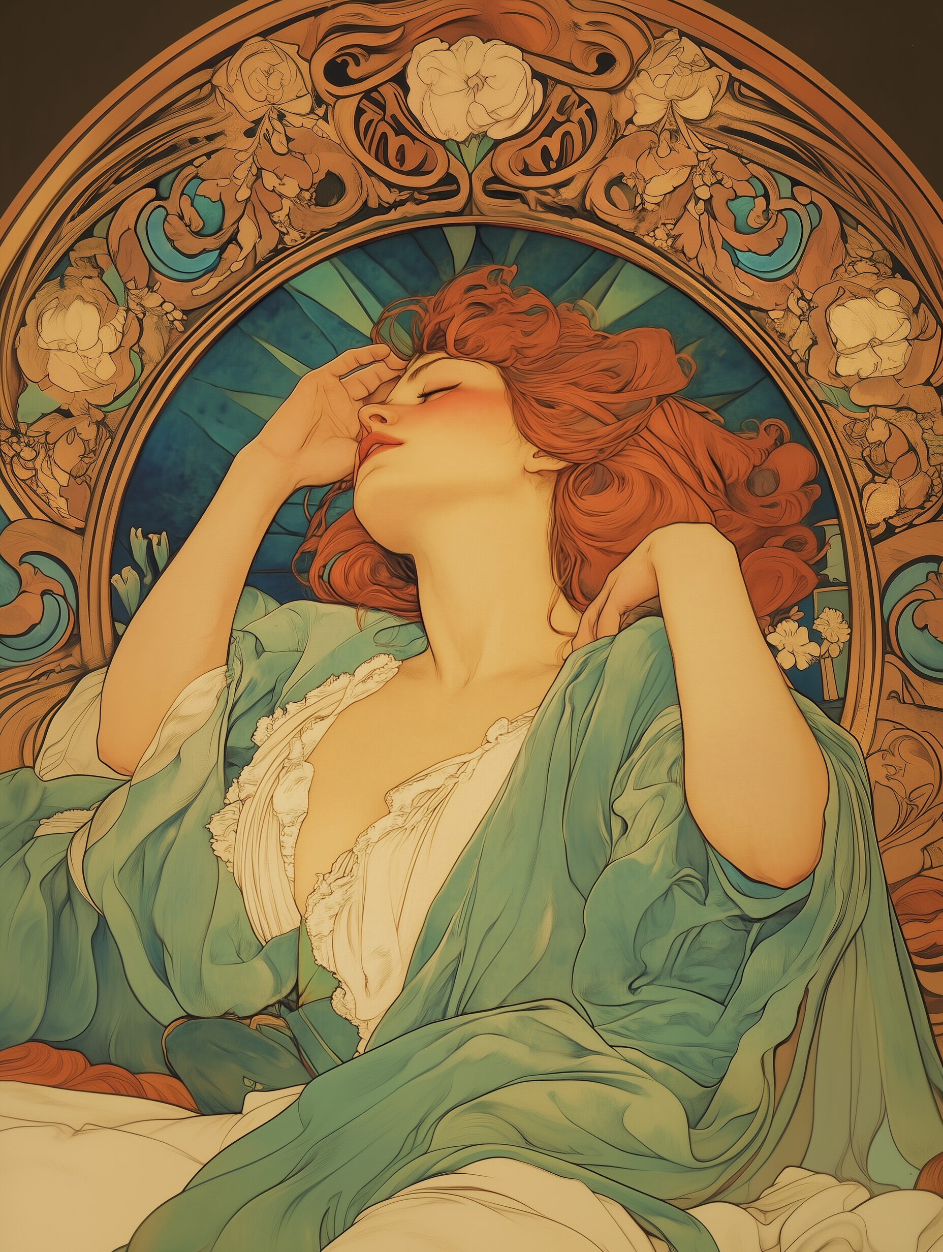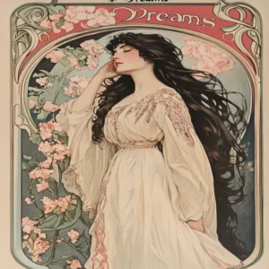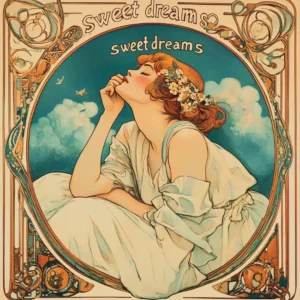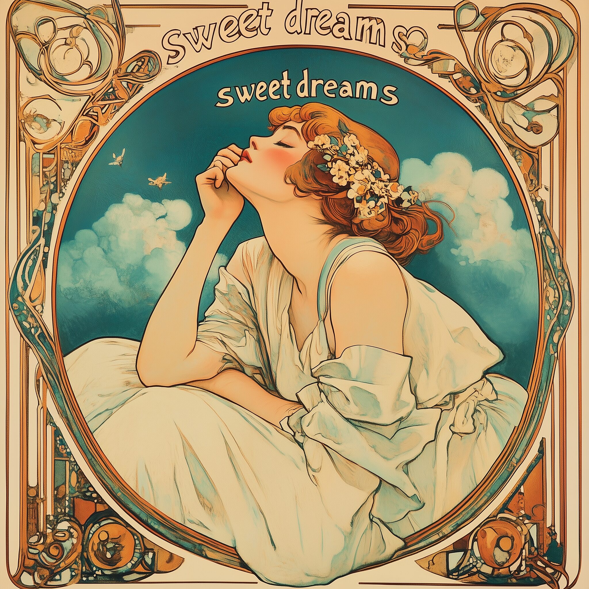Prompt: A poster in the style of Alphonse mucha, subject: a young woman looking up at the clouds, inscription on the top says ” sweet dreams “